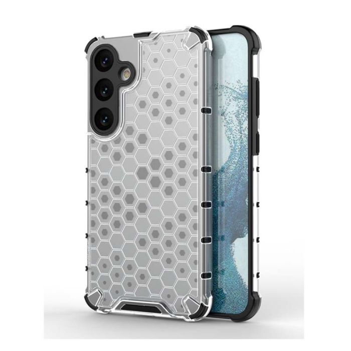 EN: A premium honeycomb transparent back design with cushioning shock absorbent corners. A feather-light, slim feel with anti-slip side grips.
